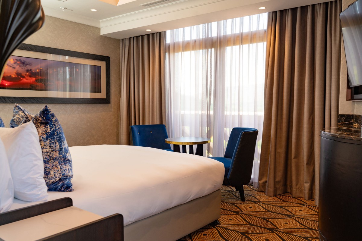 Your sanctuary has been completely transformed. Soft neutrals, warm gold accents, and touches of turquoise bring a serene, contemporary elegance to every space. Plush king-sized beds lead onto mid-century modern terraces overlooking the shimmering pool and the world-famous Gary Player Golf Course. Inside, redesigned bathrooms and a stylish coffee bar ensure comfort and sophistication at every turn.
