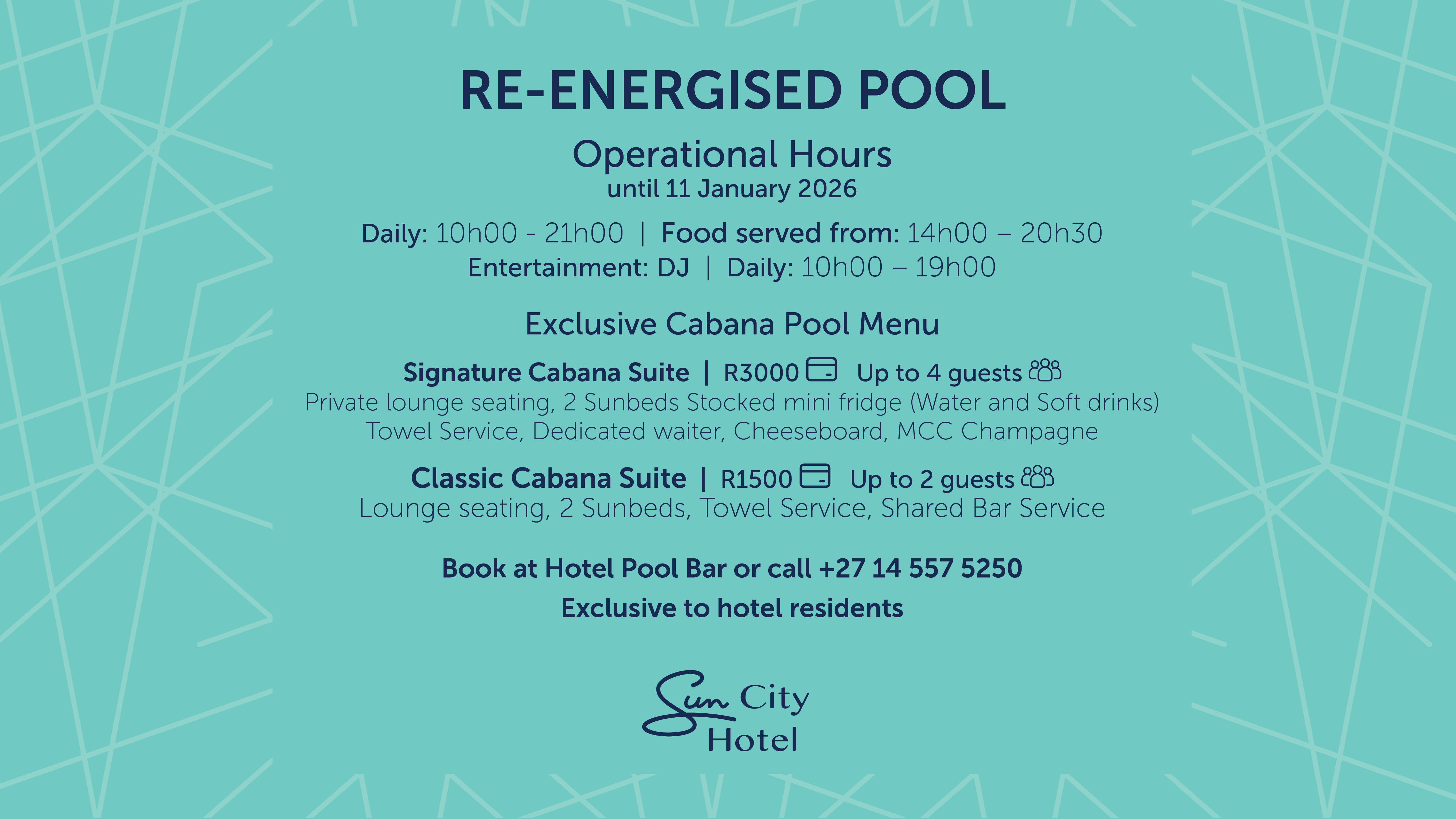 A grand central staircase leads you down into a buzzing entertainment space where energy comes alive. At the heart of it all is the new DJ island, designed to create a dynamic poolside atmosphere from day to night. Whether it’s chilled daytime beats or spirited evening sets, this is where the rhythm of Sun City takes centre stage.
